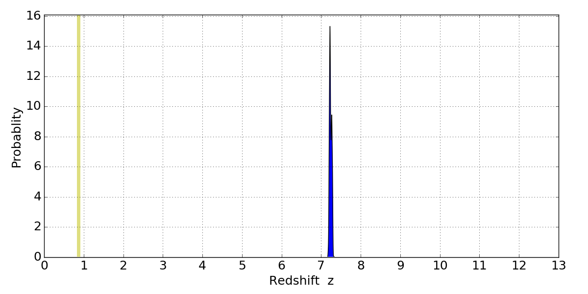 In P(z) plots: Yellow lines mark the cluster redshift z = 0.870,