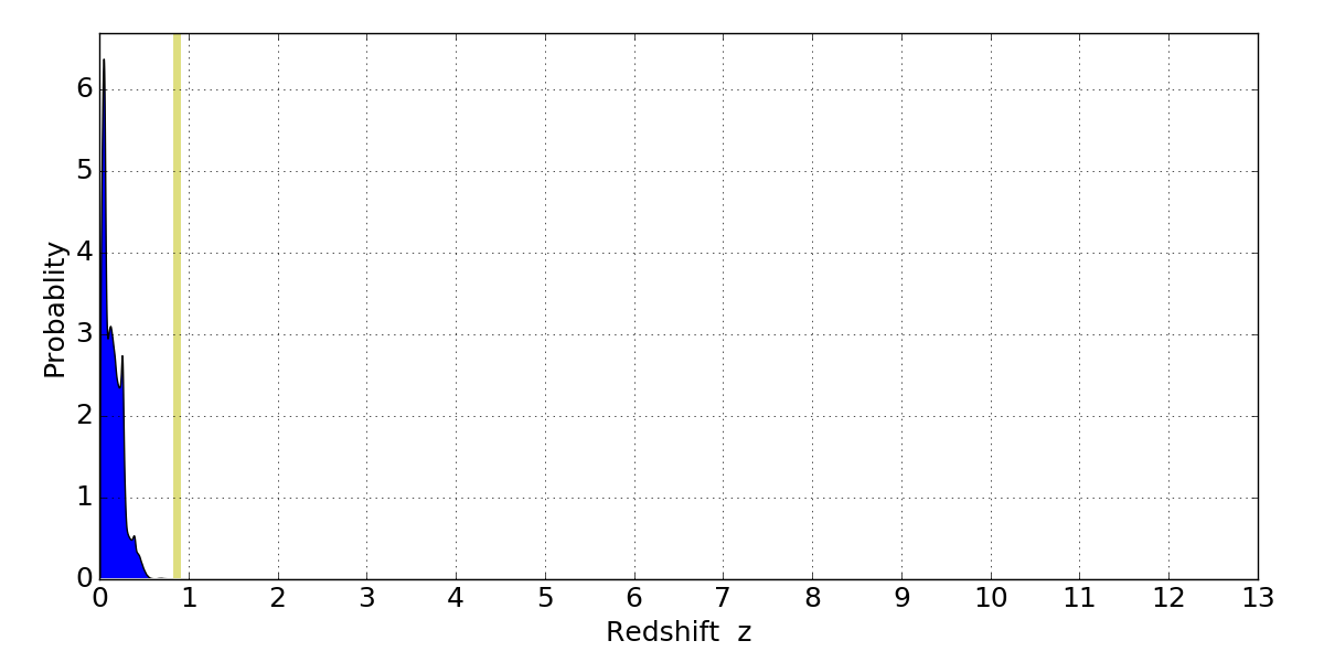 In P(z) plots: Yellow lines mark the cluster redshift z = 0.870,