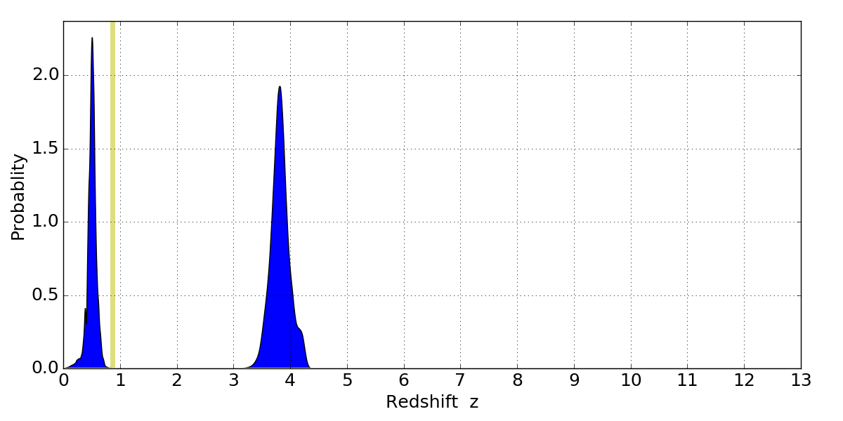 In P(z) plots: Yellow lines mark the cluster redshift z = 0.870,
