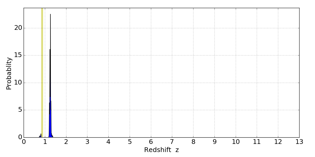 In P(z) plots: Yellow lines mark the cluster redshift z = 0.870,