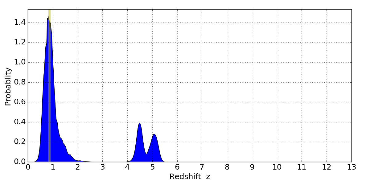 In P(z) plots: Yellow lines mark the cluster redshift z = 0.870,