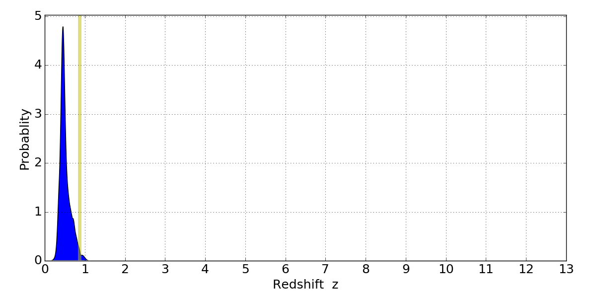 In P(z) plots: Yellow lines mark the cluster redshift z = 0.870,