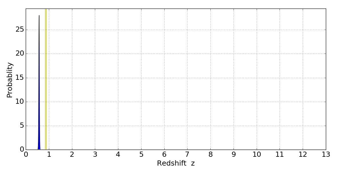 In P(z) plots: Yellow lines mark the cluster redshift z = 0.870,