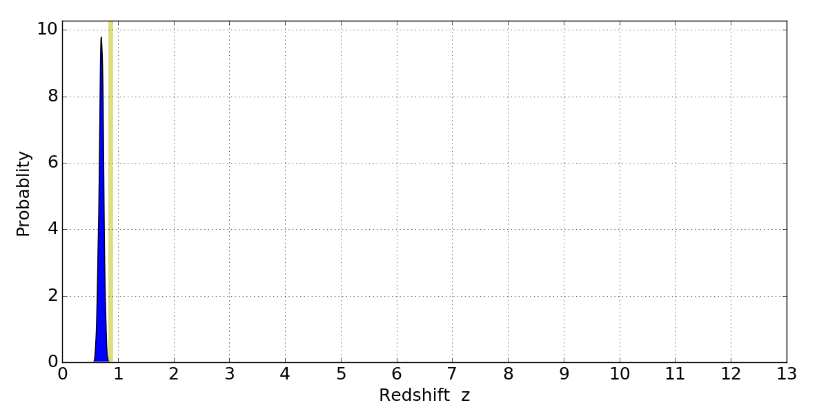 In P(z) plots: Yellow lines mark the cluster redshift z = 0.870,