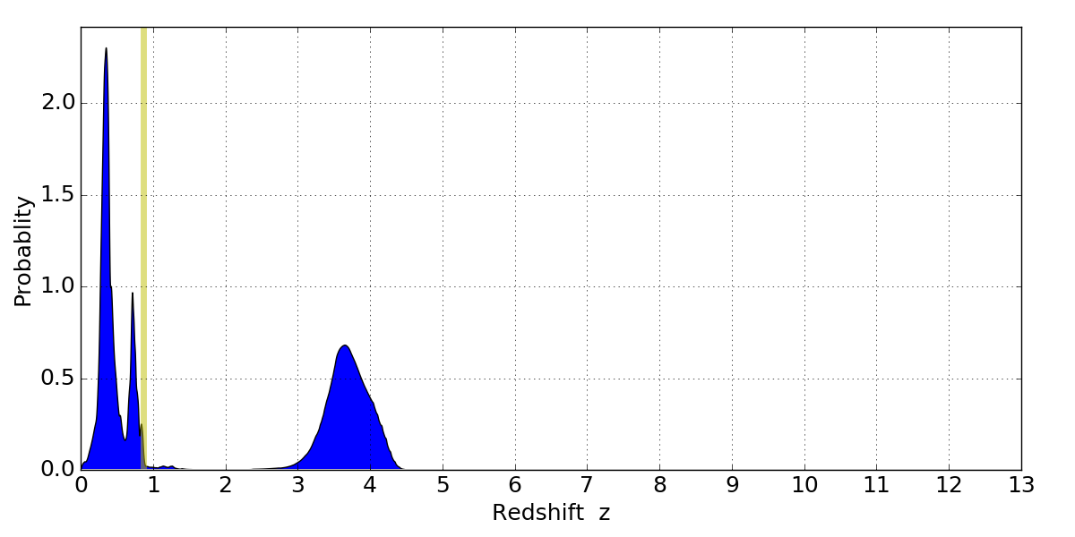 In P(z) plots: Yellow lines mark the cluster redshift z = 0.870,