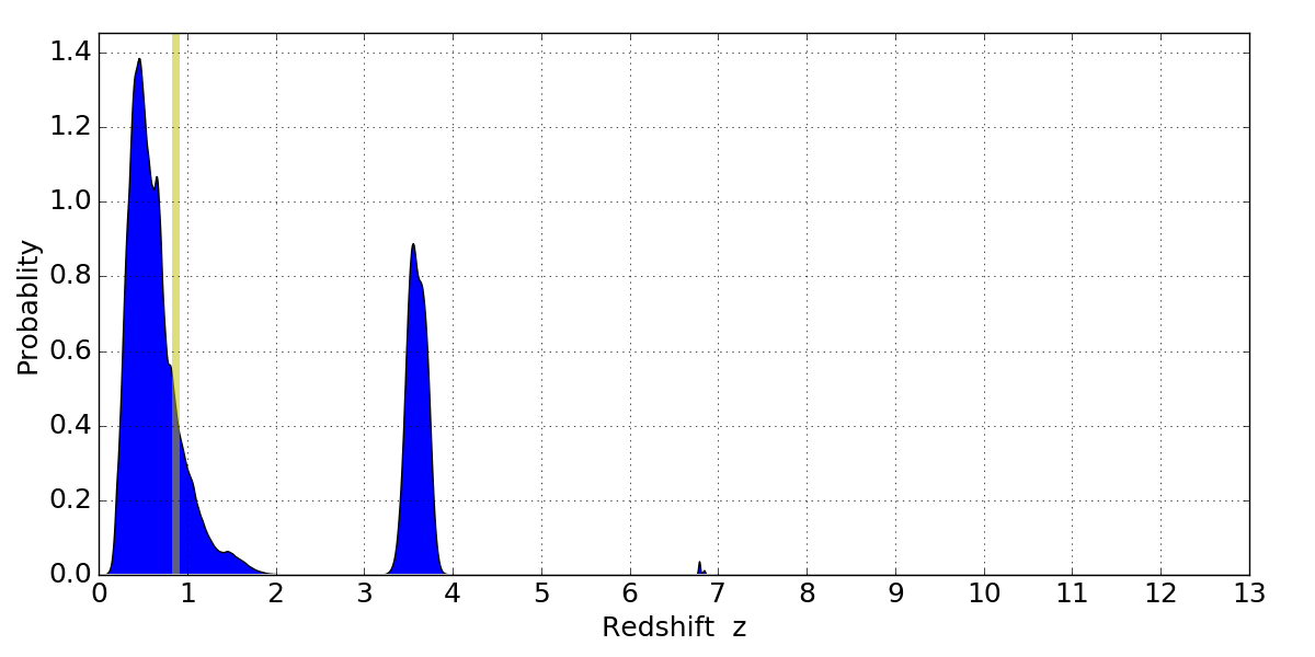 In P(z) plots: Yellow lines mark the cluster redshift z = 0.870,