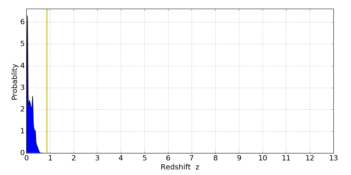 In P(z) plots: Yellow lines mark the cluster redshift z = 0.870,