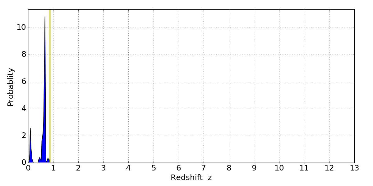 In P(z) plots: Yellow lines mark the cluster redshift z = 0.870,