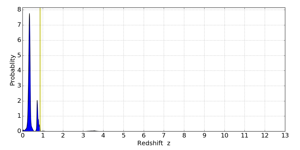 In P(z) plots: Yellow lines mark the cluster redshift z = 0.870,