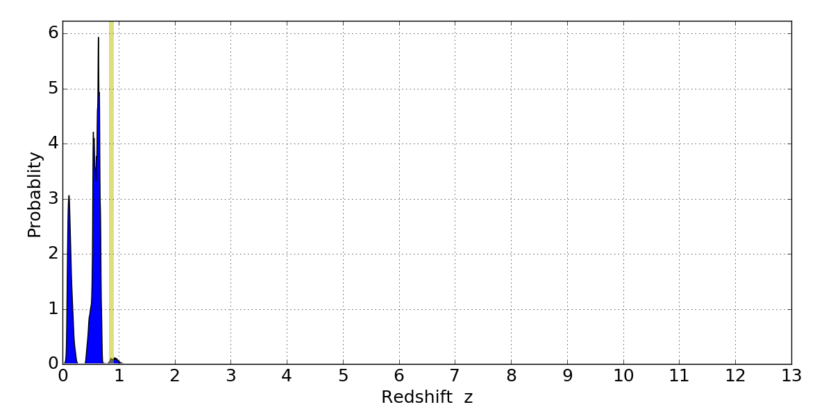 In P(z) plots: Yellow lines mark the cluster redshift z = 0.870,