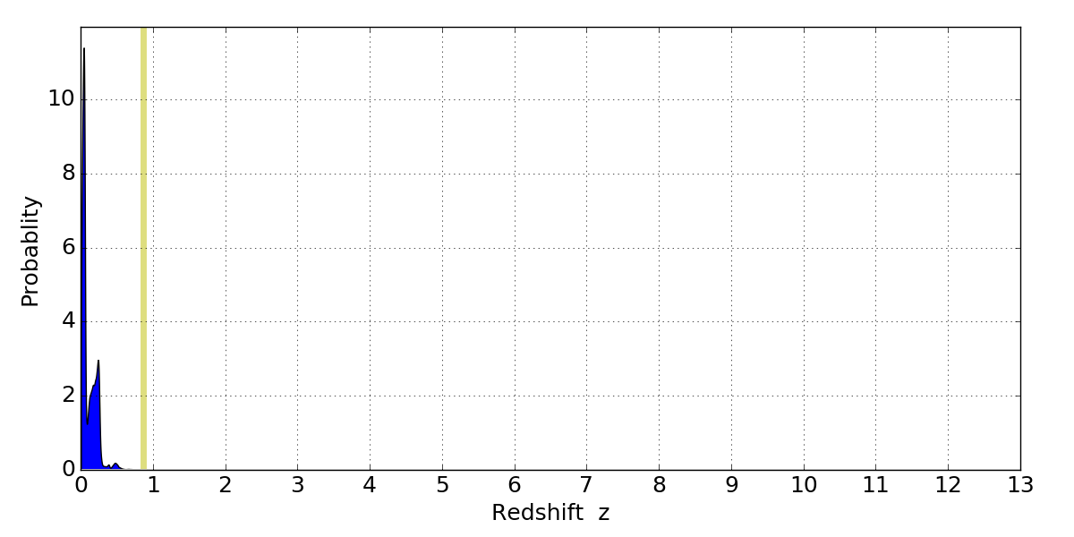 In P(z) plots: Yellow lines mark the cluster redshift z = 0.870,