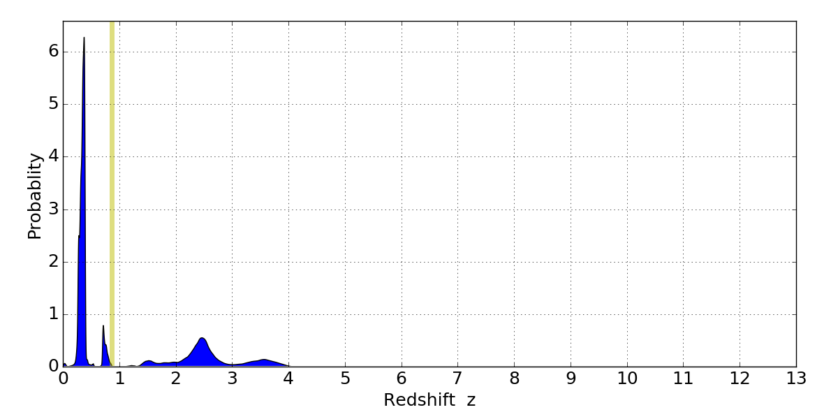 In P(z) plots: Yellow lines mark the cluster redshift z = 0.870,
