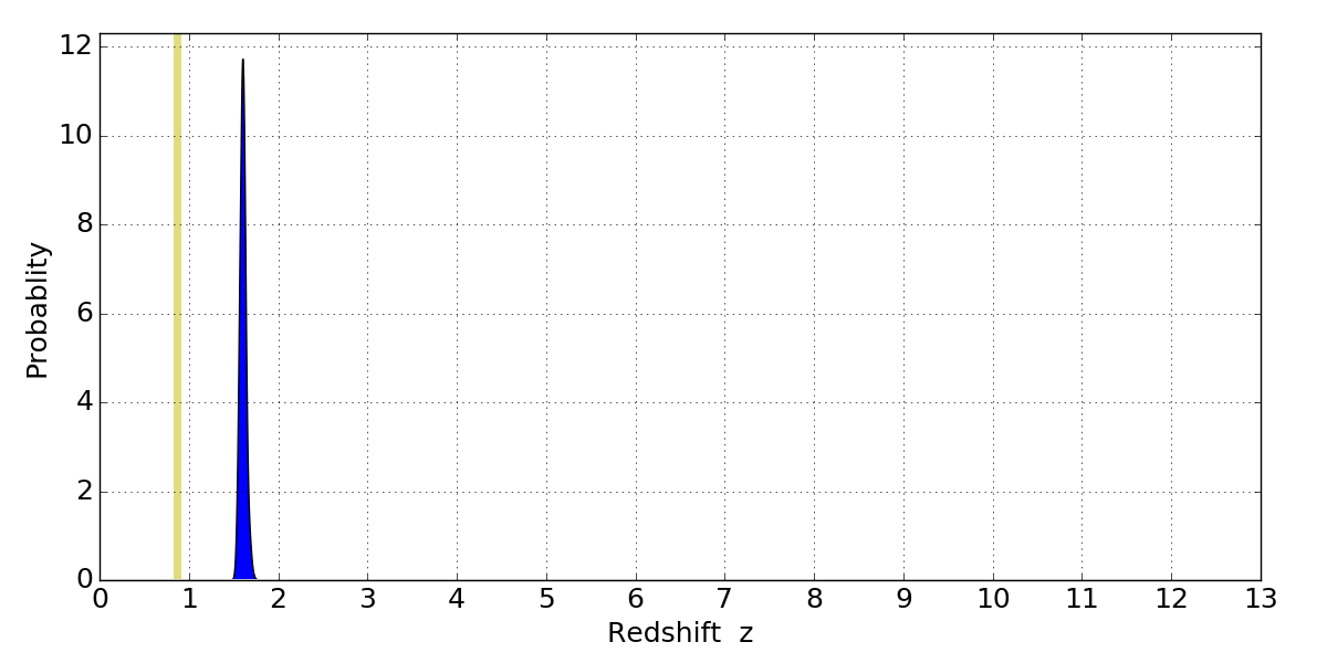 In P(z) plots: Yellow lines mark the cluster redshift z = 0.870,