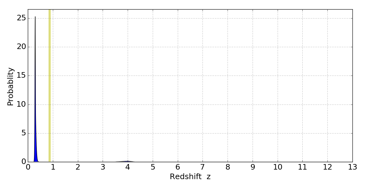 In P(z) plots: Yellow lines mark the cluster redshift z = 0.870,