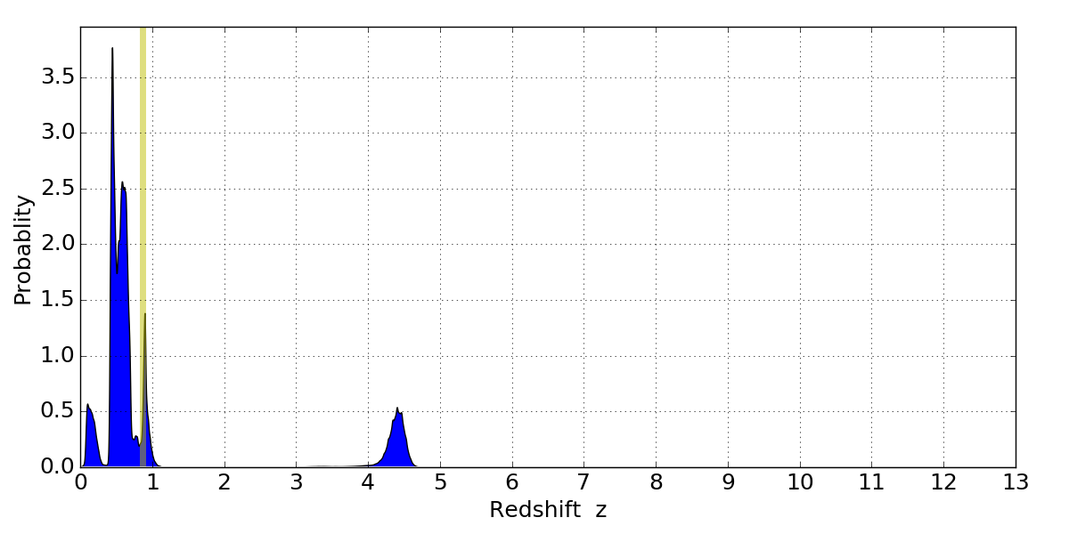 In P(z) plots: Yellow lines mark the cluster redshift z = 0.870,