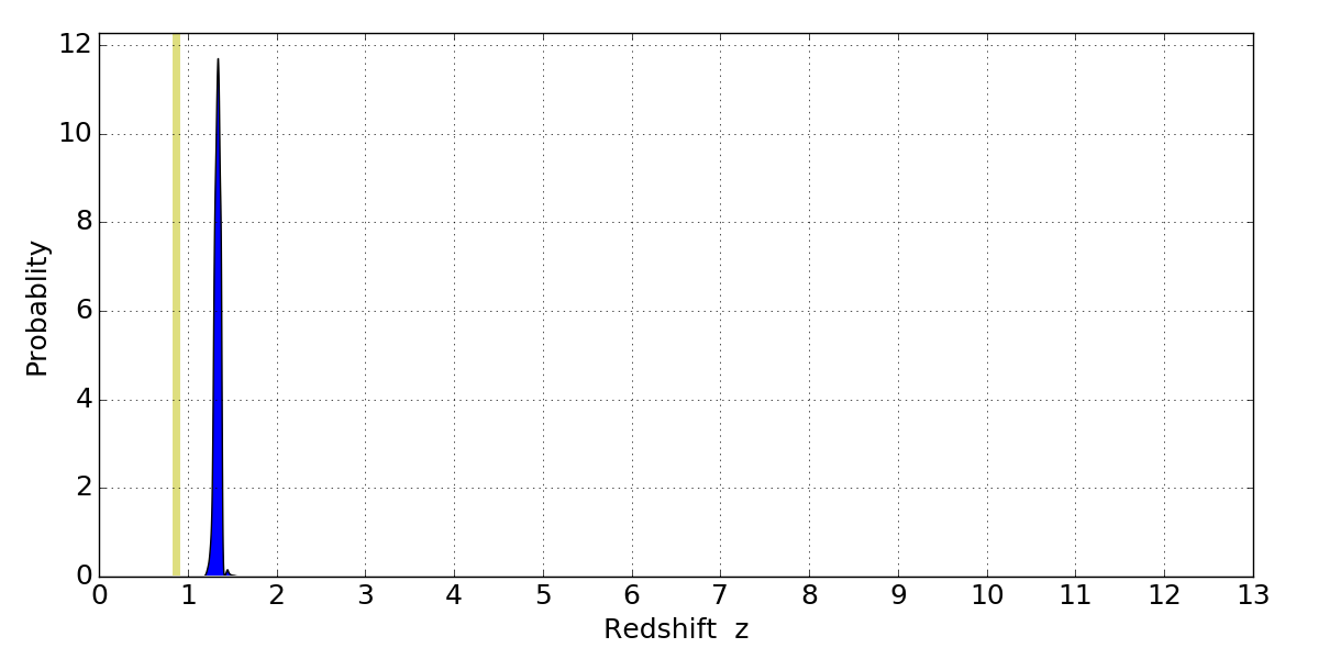 In P(z) plots: Yellow lines mark the cluster redshift z = 0.870,