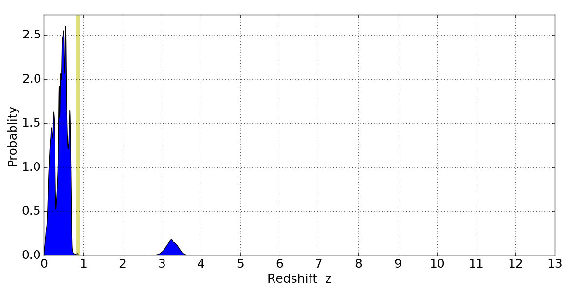 In P(z) plots: Yellow lines mark the cluster redshift z = 0.870,