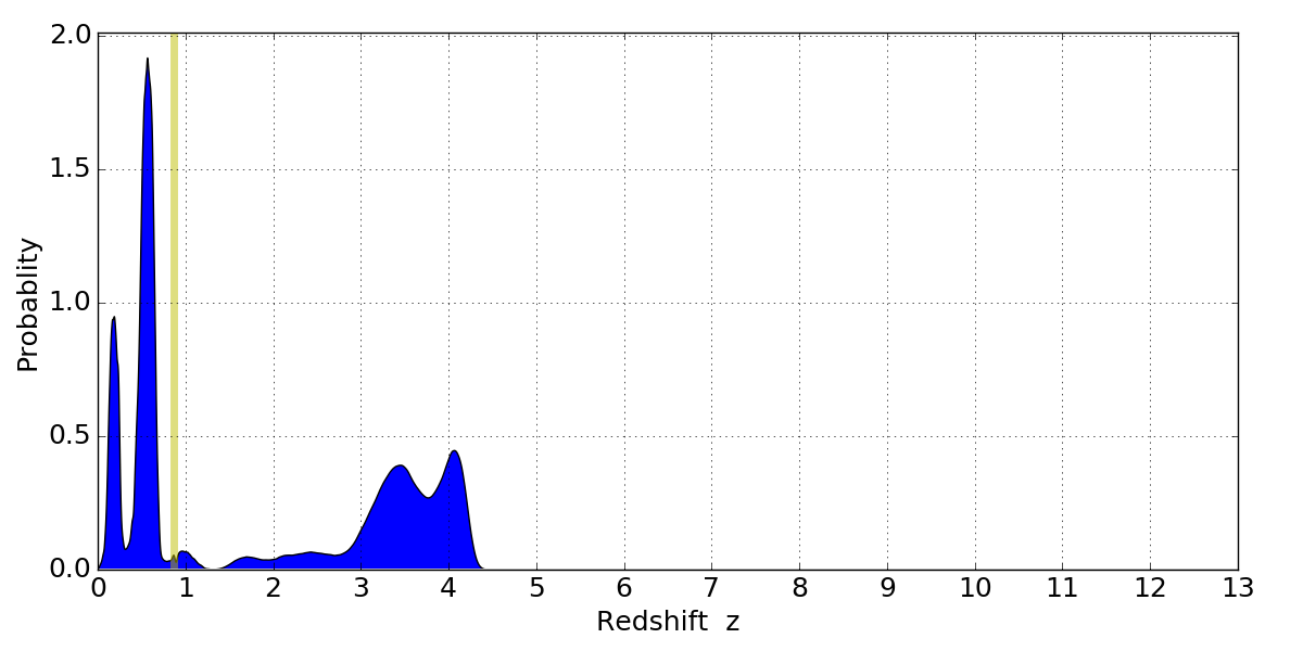 In P(z) plots: Yellow lines mark the cluster redshift z = 0.870,