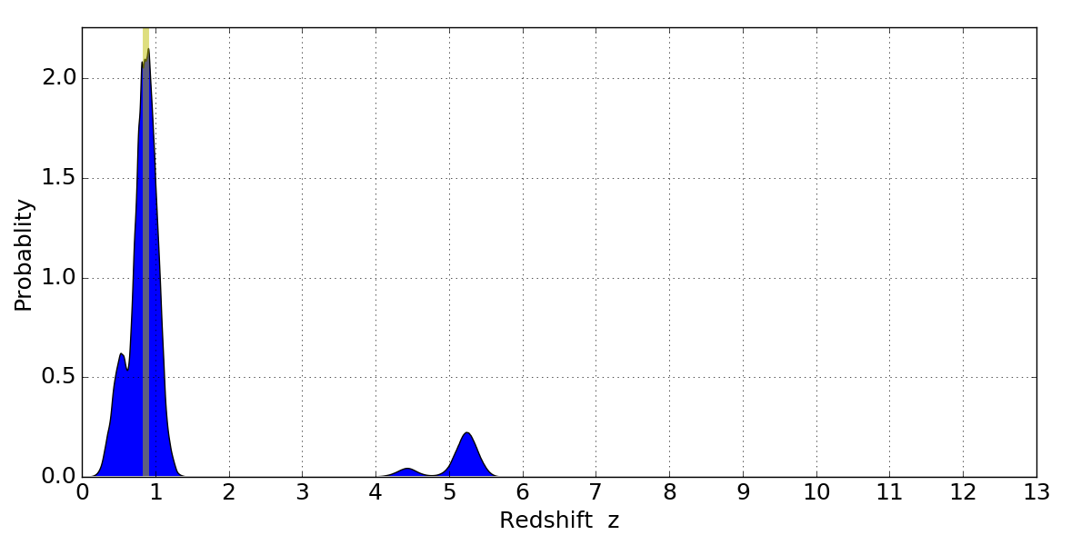 In P(z) plots: Yellow lines mark the cluster redshift z = 0.870,