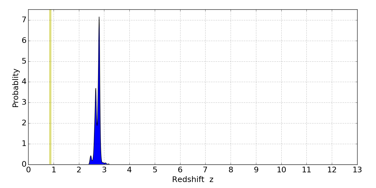 Object #8555   x,y = (4479, 3446)   RA, Dec = (01:02:51.672, -49:15:55.08) = (15.71530, -49.26530)   BPZ = 2.803 [2.490--2.882]   type = 5.70 (Sbc_B10 - ES0_B10)   chisq2 = 0.07   ODDS = 0.82   z_cluster = 0.870