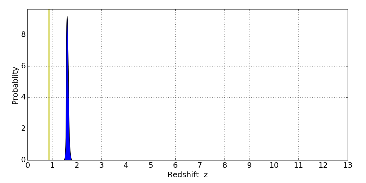 In P(z) plots: Yellow lines mark the cluster redshift z = 0.870,