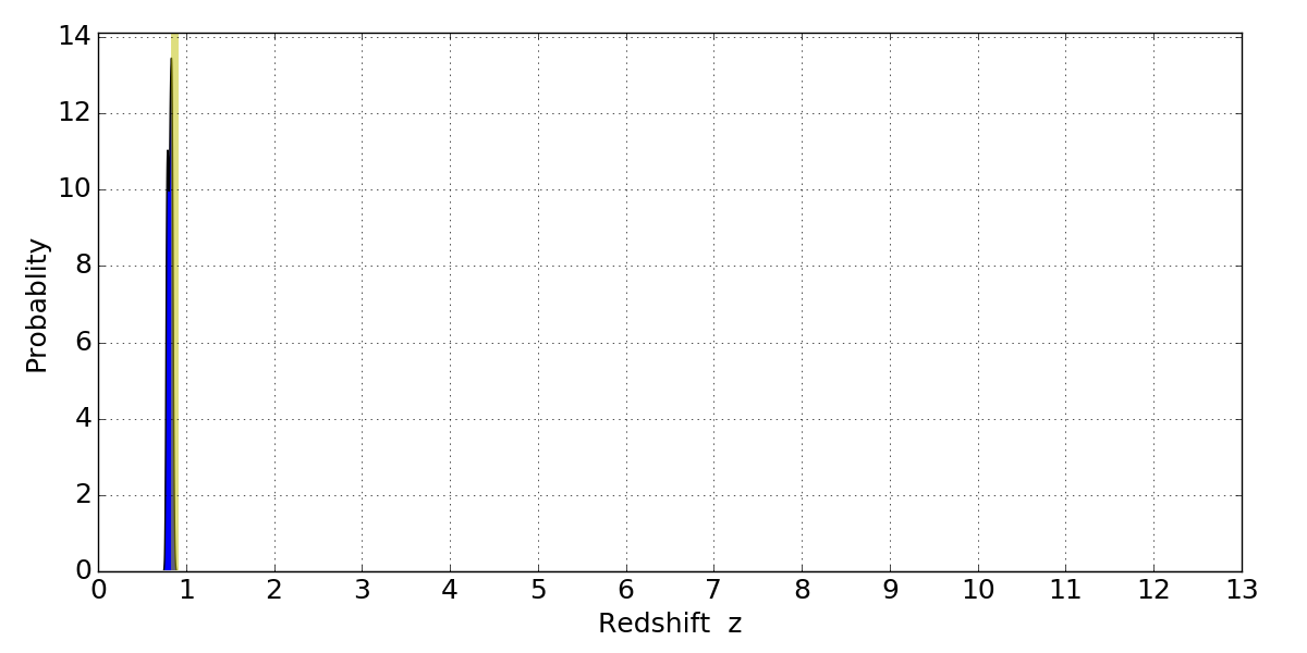 In P(z) plots: Yellow lines mark the cluster redshift z = 0.870,