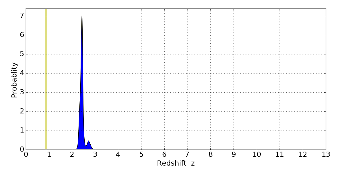 In P(z) plots: Yellow lines mark the cluster redshift z = 0.870,