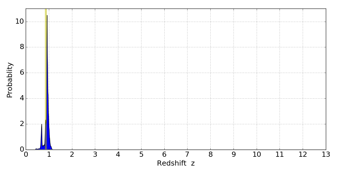 In P(z) plots: Yellow lines mark the cluster redshift z = 0.870,