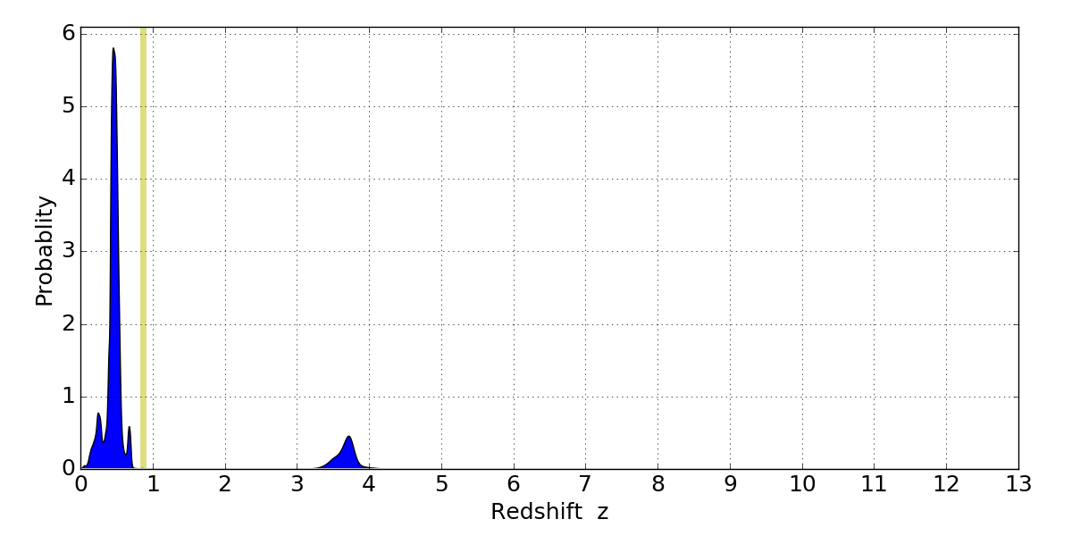 In P(z) plots: Yellow lines mark the cluster redshift z = 0.870,