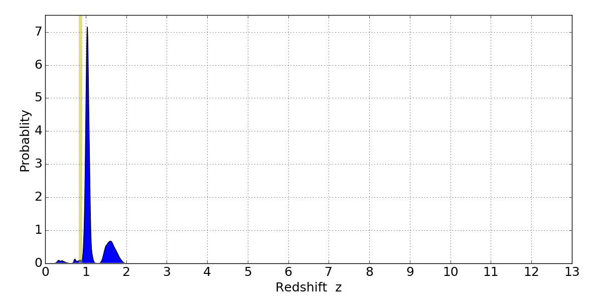 In P(z) plots: Yellow lines mark the cluster redshift z = 0.870,