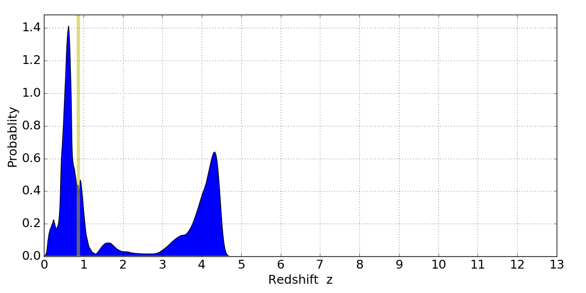 In P(z) plots: Yellow lines mark the cluster redshift z = 0.870,