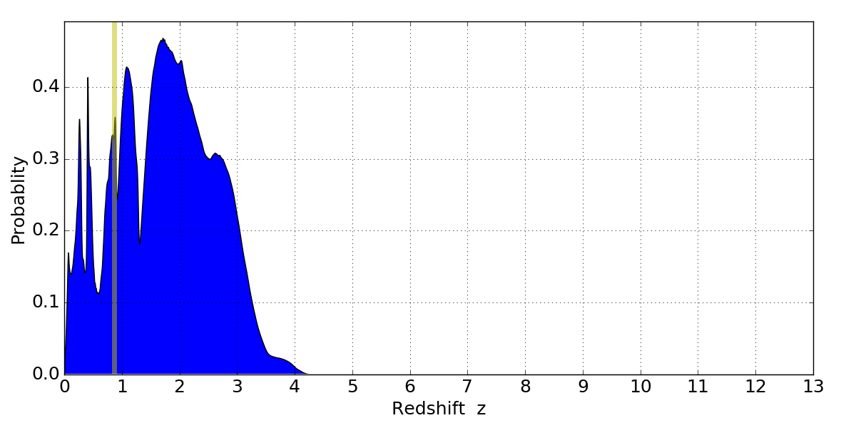 In P(z) plots: Yellow lines mark the cluster redshift z = 0.870,