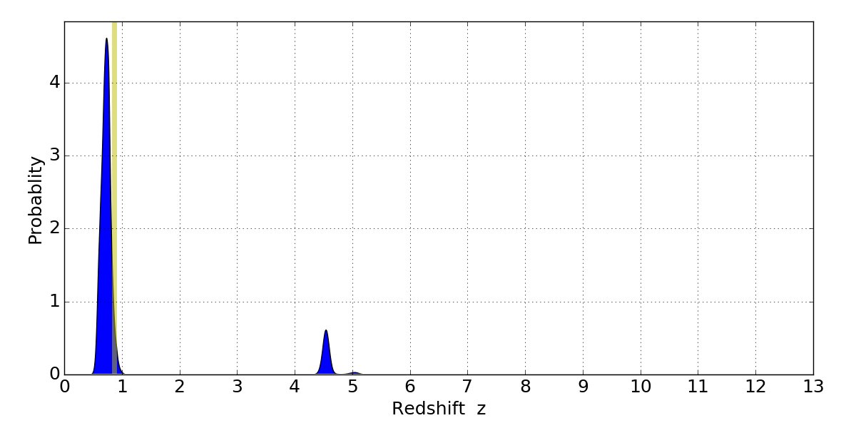 In P(z) plots: Yellow lines mark the cluster redshift z = 0.870,