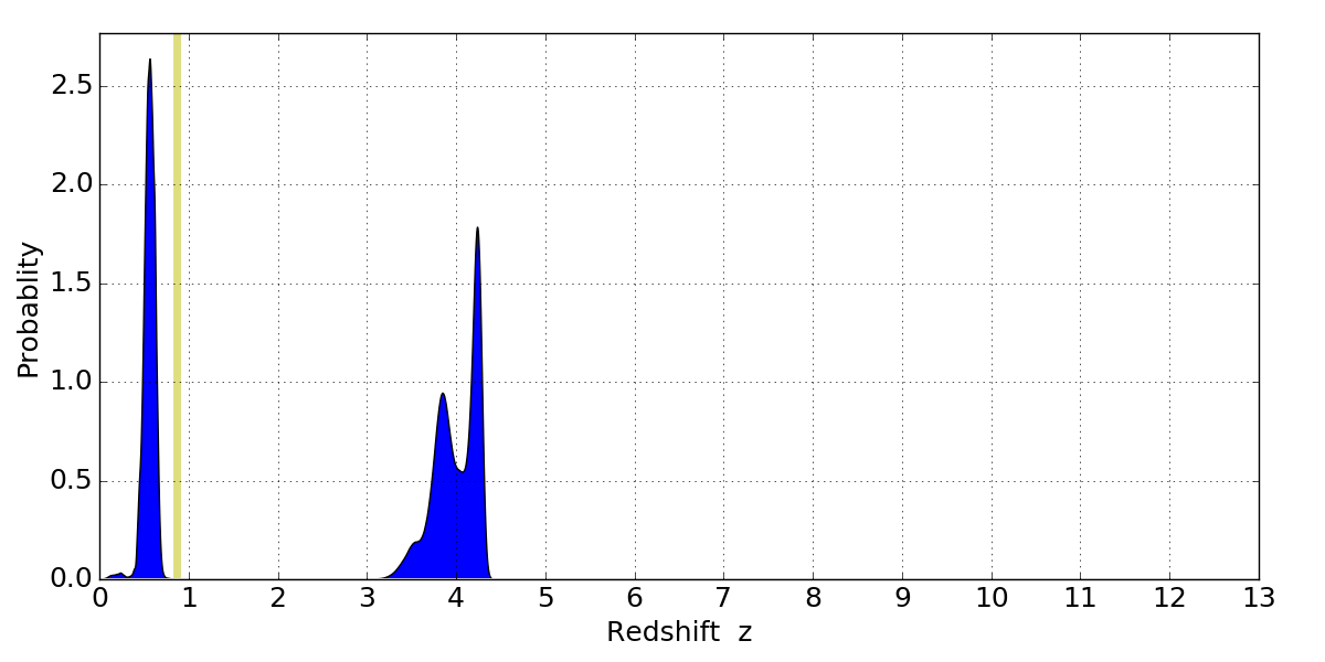 In P(z) plots: Yellow lines mark the cluster redshift z = 0.870,