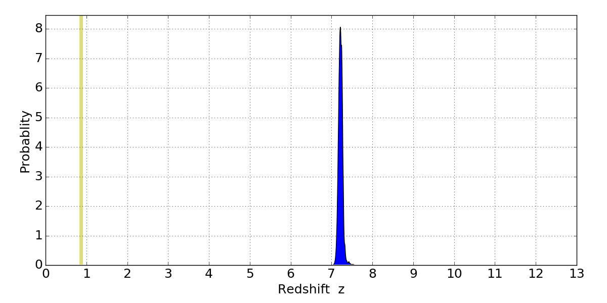 In P(z) plots: Yellow lines mark the cluster redshift z = 0.870,
