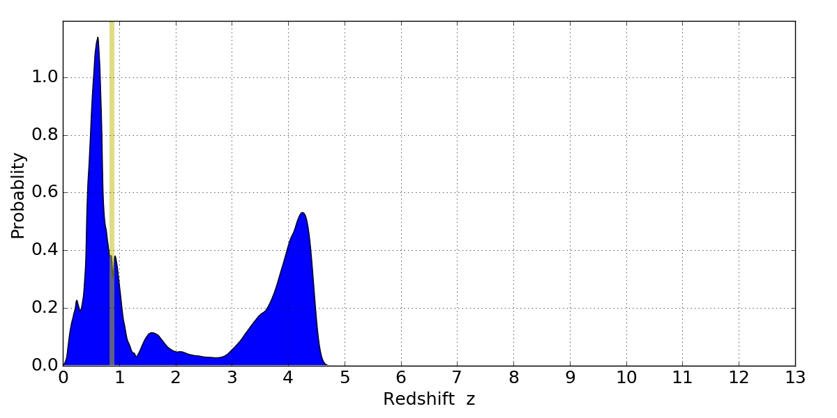 In P(z) plots: Yellow lines mark the cluster redshift z = 0.870,