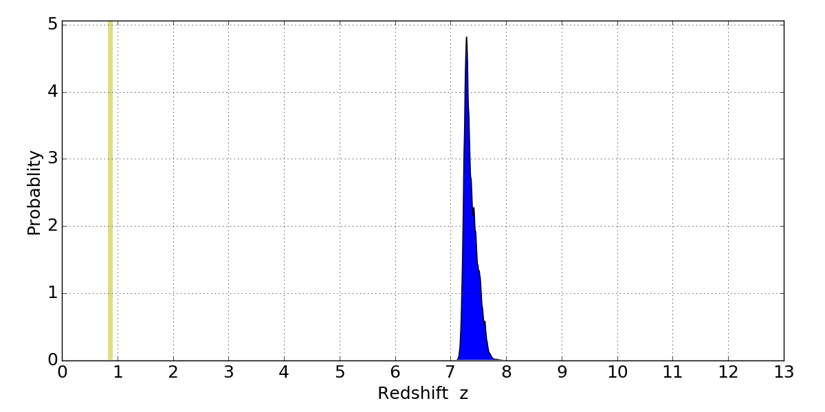In P(z) plots: Yellow lines mark the cluster redshift z = 0.870,