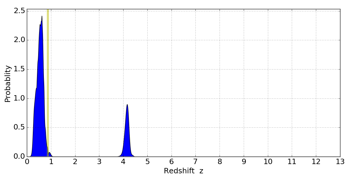 In P(z) plots: Yellow lines mark the cluster redshift z = 0.870,