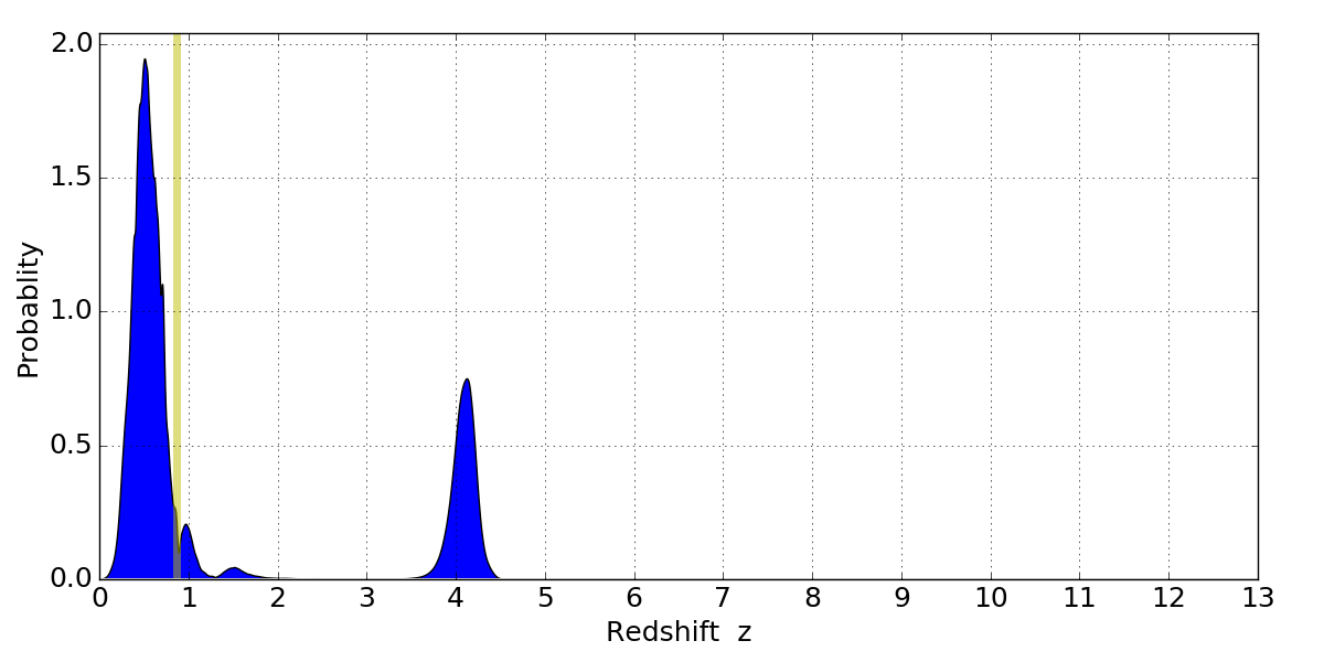 In P(z) plots: Yellow lines mark the cluster redshift z = 0.870,