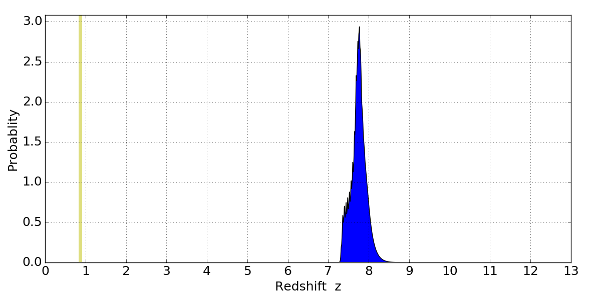 In P(z) plots: Yellow lines mark the cluster redshift z = 0.870,