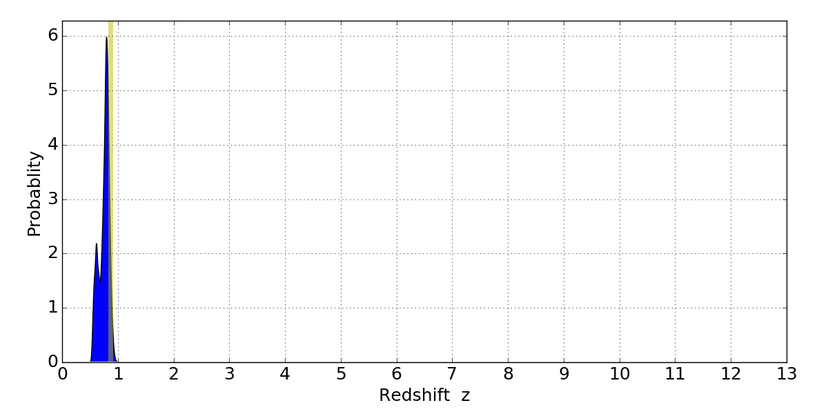 In P(z) plots: Yellow lines mark the cluster redshift z = 0.870,