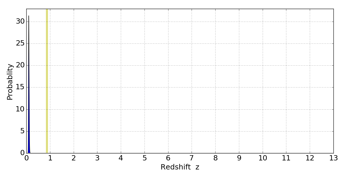 In P(z) plots: Yellow lines mark the cluster redshift z = 0.870,