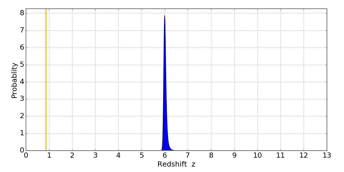 In P(z) plots: Yellow lines mark the cluster redshift z = 0.870,