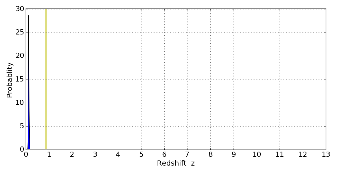 In P(z) plots: Yellow lines mark the cluster redshift z = 0.870,