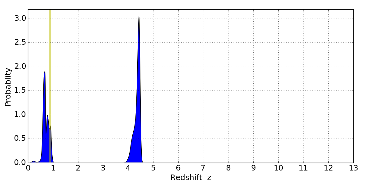In P(z) plots: Yellow lines mark the cluster redshift z = 0.870,