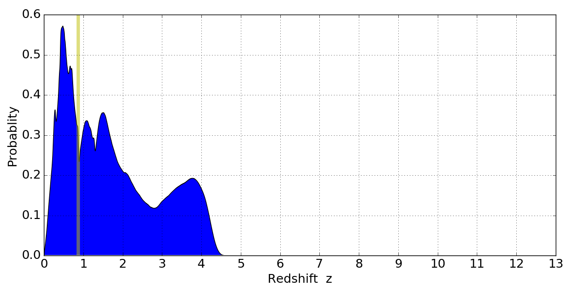 In P(z) plots: Yellow lines mark the cluster redshift z = 0.870,