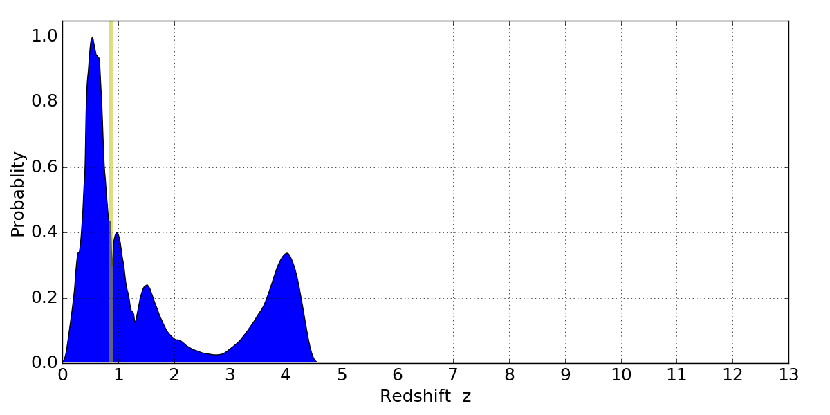 In P(z) plots: Yellow lines mark the cluster redshift z = 0.870,