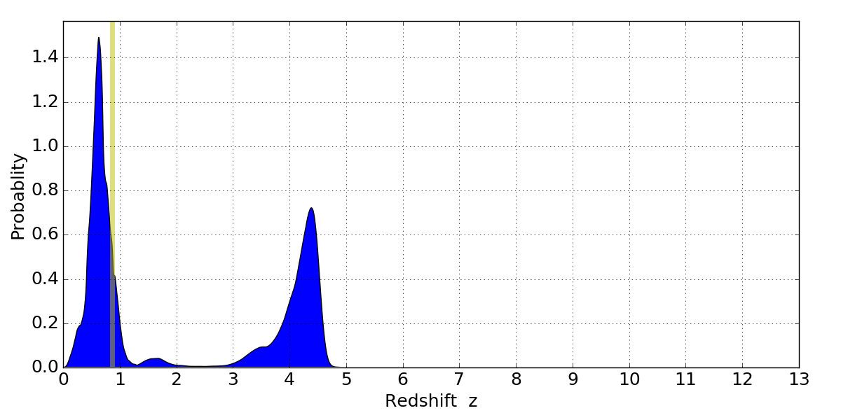 In P(z) plots: Yellow lines mark the cluster redshift z = 0.870,