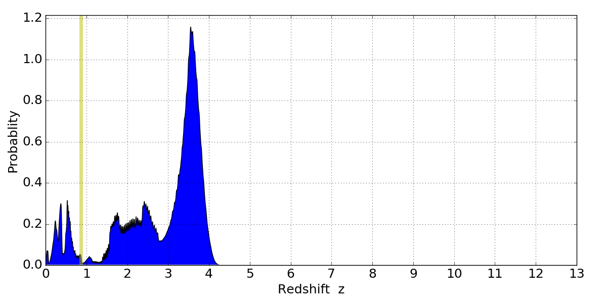 In P(z) plots: Yellow lines mark the cluster redshift z = 0.870,