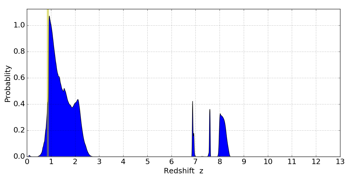 In P(z) plots: Yellow lines mark the cluster redshift z = 0.870,